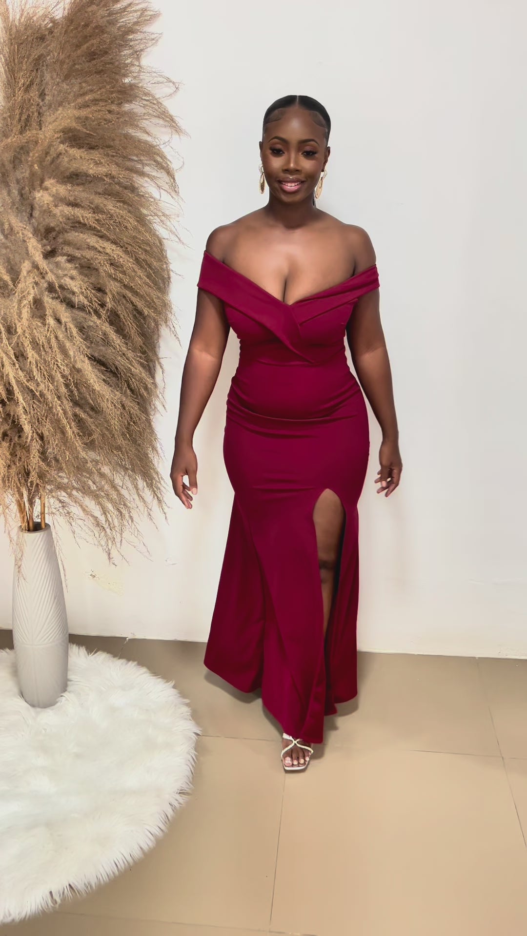 Crimson Elegance Off-the-Shoulder Slit Gown